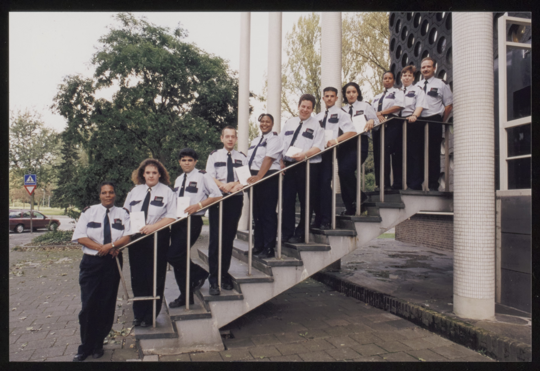Dit is geen bureaupersoneel van een politiepost, maar het zijn stadswachten op de trap van het toenmalige hoofdbureau van politie aan de Nassauweg. 1998