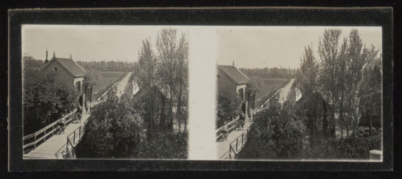 - Stereofoto van de brug over de Vuile Vliet naar de Watermolenweide, gezien vanaf de Weeskinderendijk.