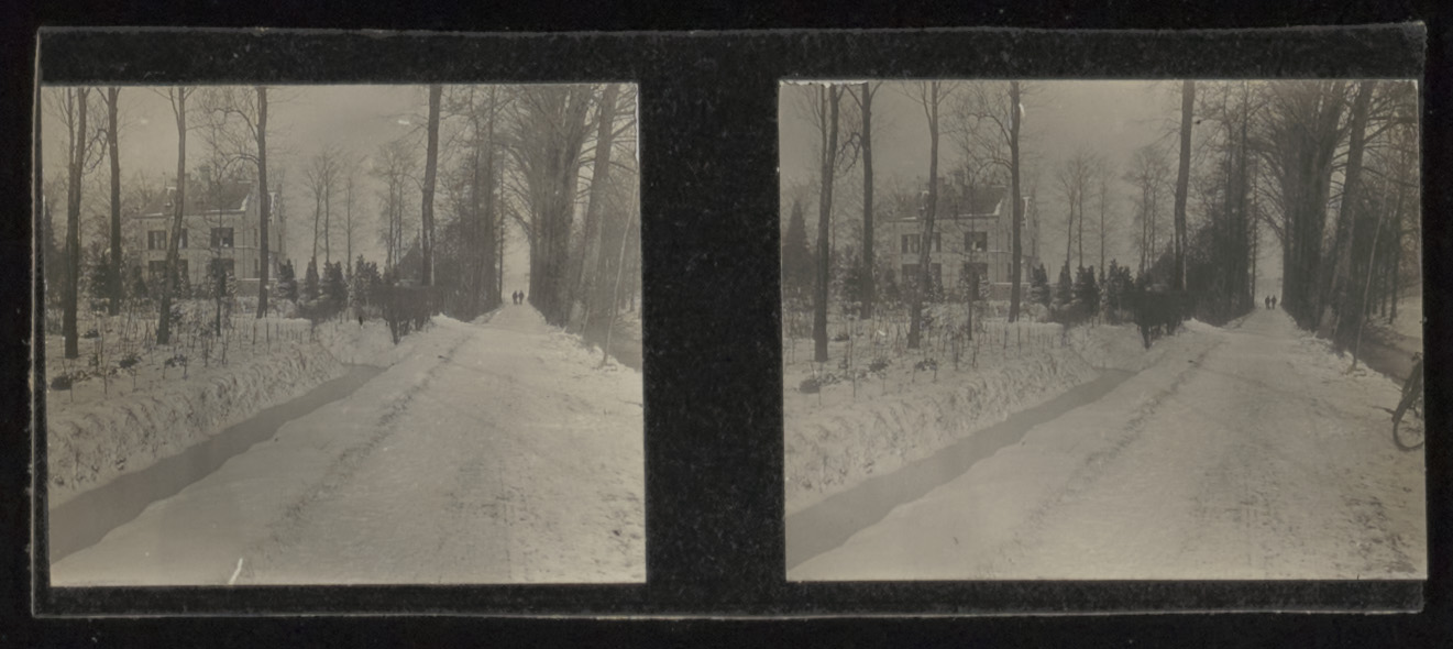 - Stereofoto van kasteel Crabbehoff (links) aan het Crabbehofpad - de latere Abraham Kuijperweg - gezien naar het noorden.