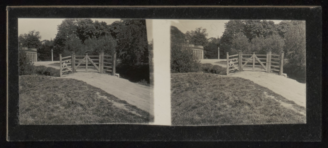Stereofoto van het pad en toegangshek naar de oranjerie bij de villa van De Roo nabij …