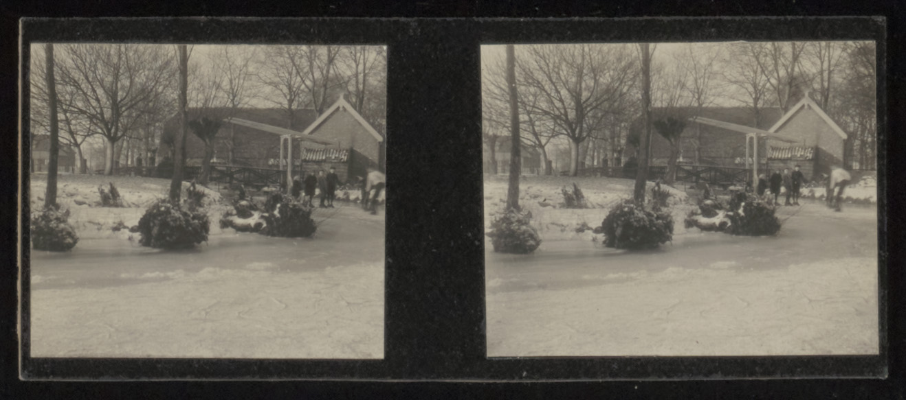 Stereofoto van hoeve Gravenstein aan de Rijksstraatweg, de Oostkil op de voorgrond.