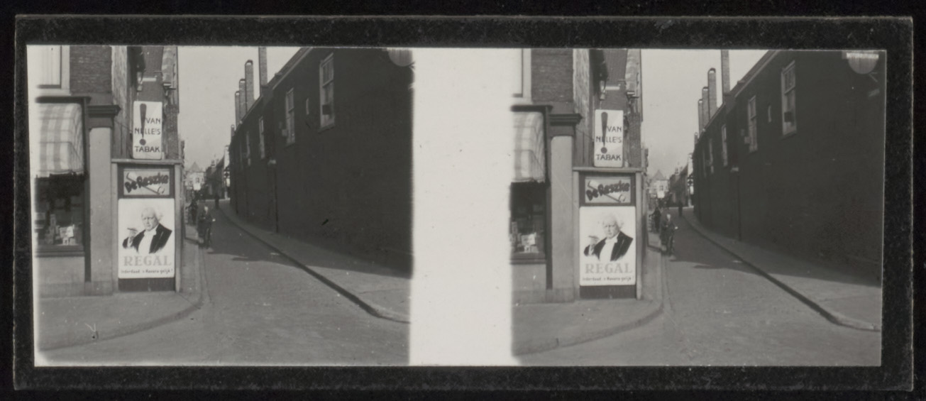 Stereofoto van de Lenghenstraat vanaf het Bagijnhof richting Vriesestraat. Rechts de …