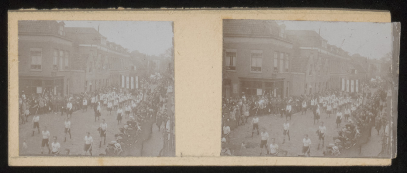 - Stereofoto van een optocht op de Sint Jorisweg bij de hoek van het Kasperspad (links).