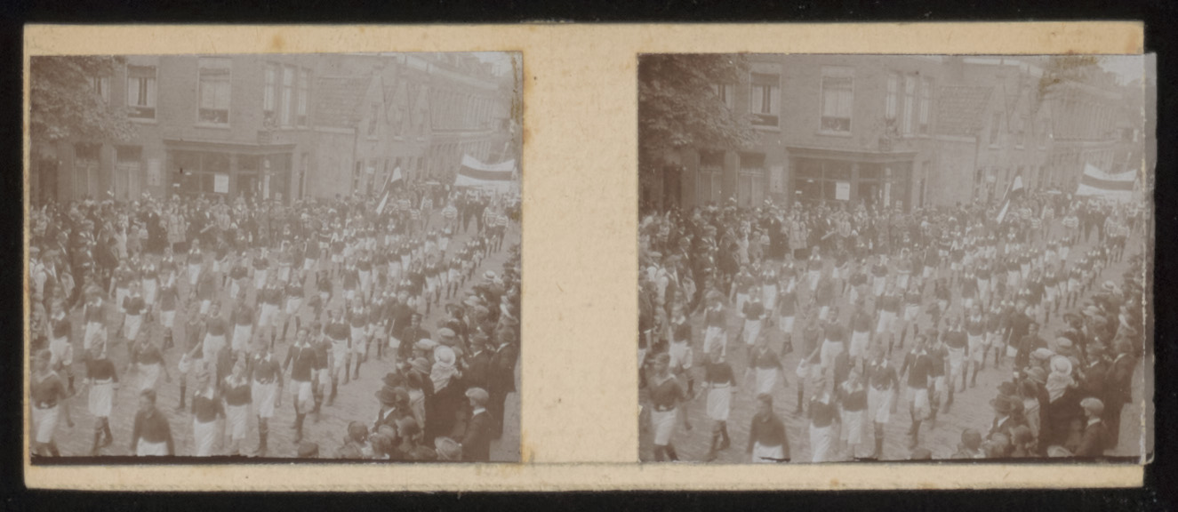 - Stereofoto van een optocht op de Sint Jorisweg bij de hoek van het Kasperspad (links).