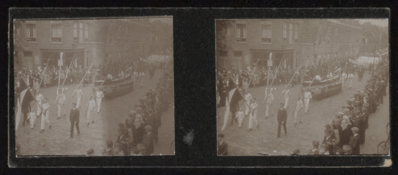 - Stereofoto van een optocht op de Sint Jorisweg bij de hoek van het Kasperspad (links).