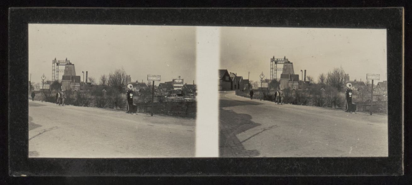 - Stereofoto van de 's-Gravendeelsedijk t.h.v. de Glazenstraat richting Dokbrug. Voor de brug staat de romp van molen De Pelikaan op de hoek van de Weeskinderendijk.