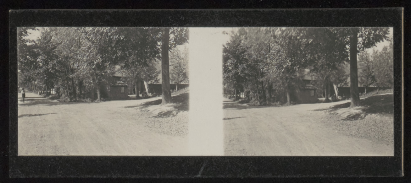Stereofoto van de Rechte Zandweg in de richting van het Damplein. De oprit naar rechts …