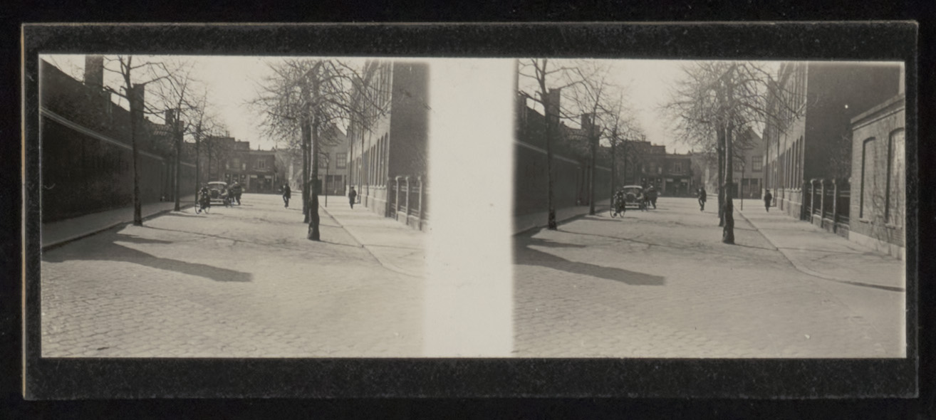 - Stereofoto van de Museumstraat vanaf de Nieuwstraat (recht) richting Vest. Links de Arend Maartenshof rechts de bijzondere lagere school.