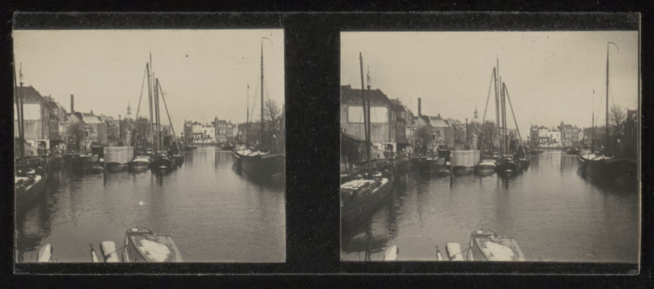 - Stereofoto van de Wijnhaven vanaf de Nieuwbrug richting Boomstraat / Taankade. Links de Wijnstraat, rechts de Taankade.