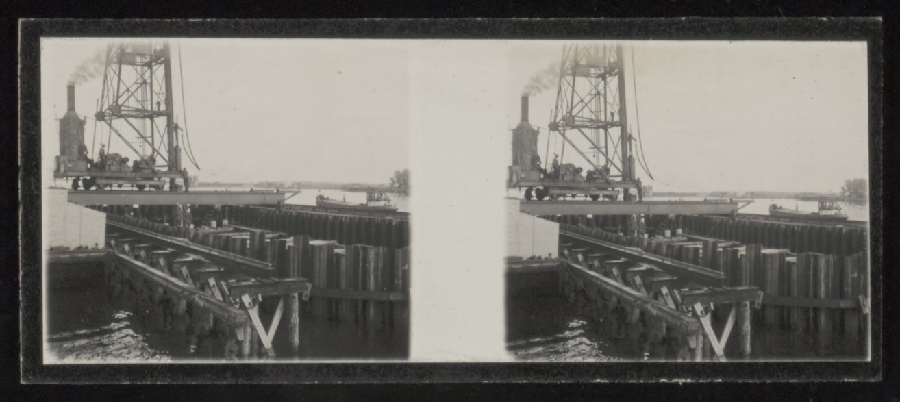 Stereofoto van het heien van houten palen die een stelling moeten gaan dragen waarop de …