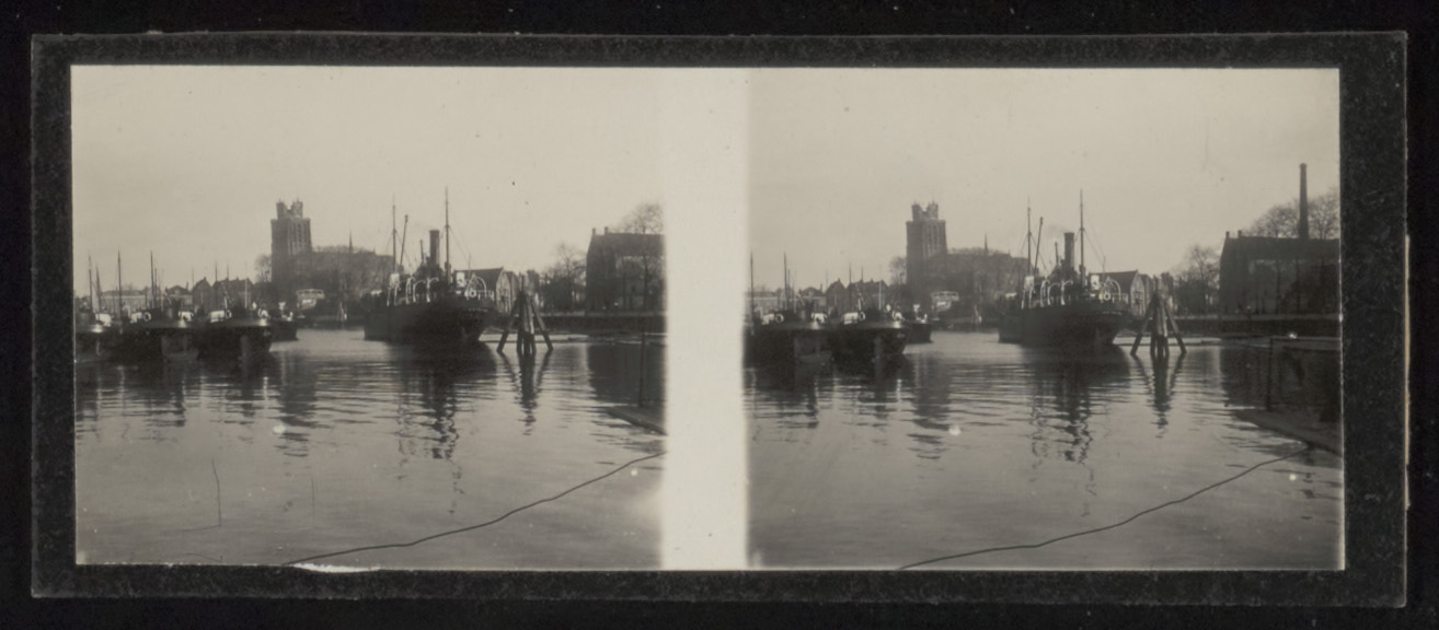 Stereofoto van de Kalkhaven vanaf Binnen Kalkhaven. Rechts de Dogcakesfabriek aan het …