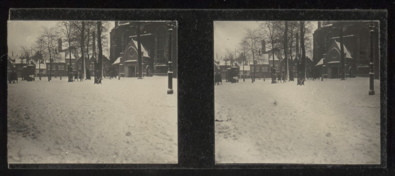 Stereofoto van de Nieuwkerk op het Nieuwkerksplein.