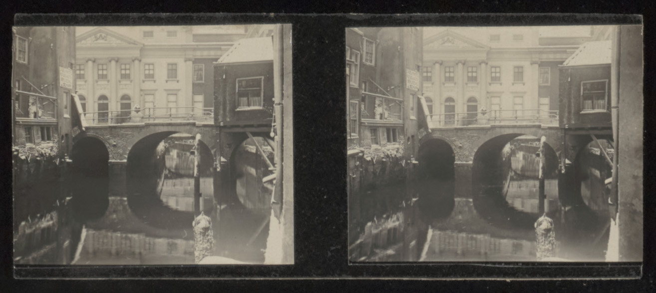 - Stereofoto van de Voorstraatshaven vanaf de Grote Spuisteiger richting Lombardbrug en stadhuis. Links de Grotekerksbuurt.