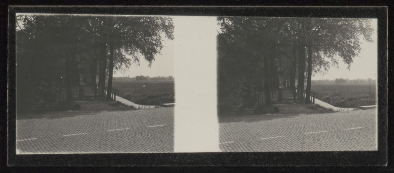 - Stereofoto van het toegangshek tot het Boonepad aan de zijde van de Krispijnseweg.