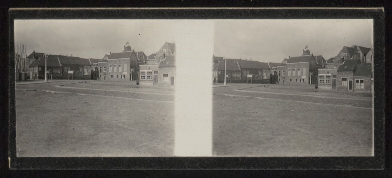 - Stereofoto van braakliggend terrein vóór de aanleg van het Bethlehemplein, gezien vanaf de Raamstraat richting Elfhuizen en Bagijnestraat.
