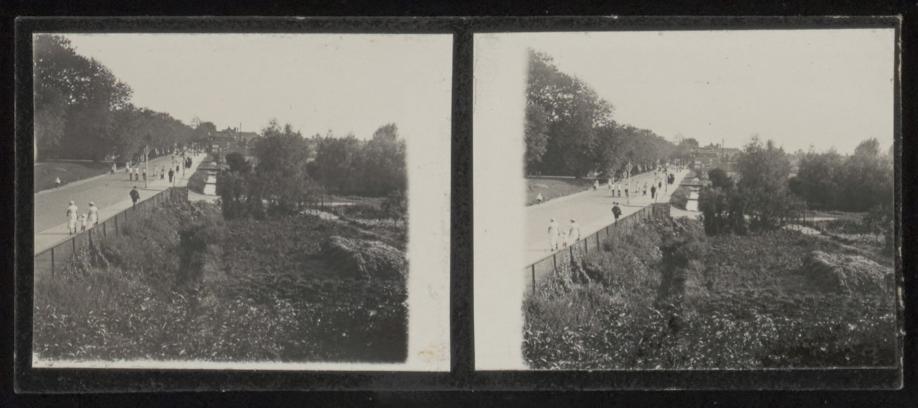 - Stereofoto van de Krispijnseweg naar het zuiden, gezien vanuit het seinhuis. Rechts de Watermolenweide.