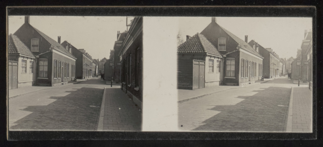 - Stereofoto van het Geldelozepad in de richting van de Spuiweg. Halverwege rechts het Papeterspad.