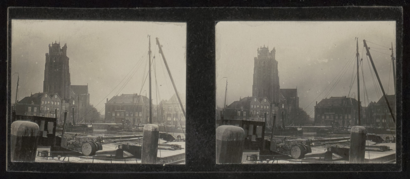 - Stereofoto van de Leuvehaven richting Korte Geldersekade (links), Grote Kerk, Leuvebrug en Bomkade.