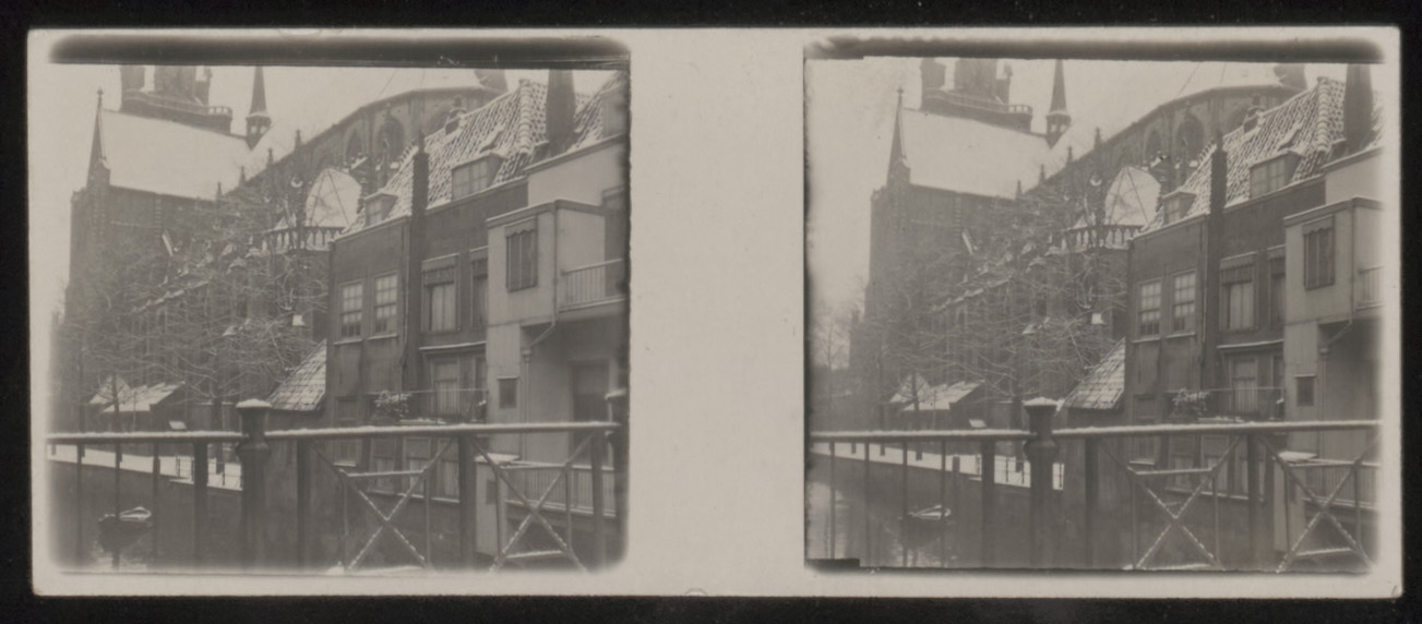 Stereofoto van de Voorstraatshaven vanaf de Pelserbrug richting Pottenkade en Grote …