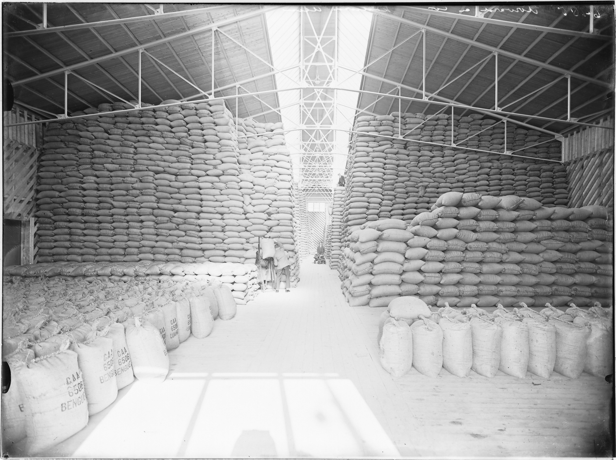 Loods met zakken rijst van firma Howards & Co. Rijstpelmolen te Zwijndrecht