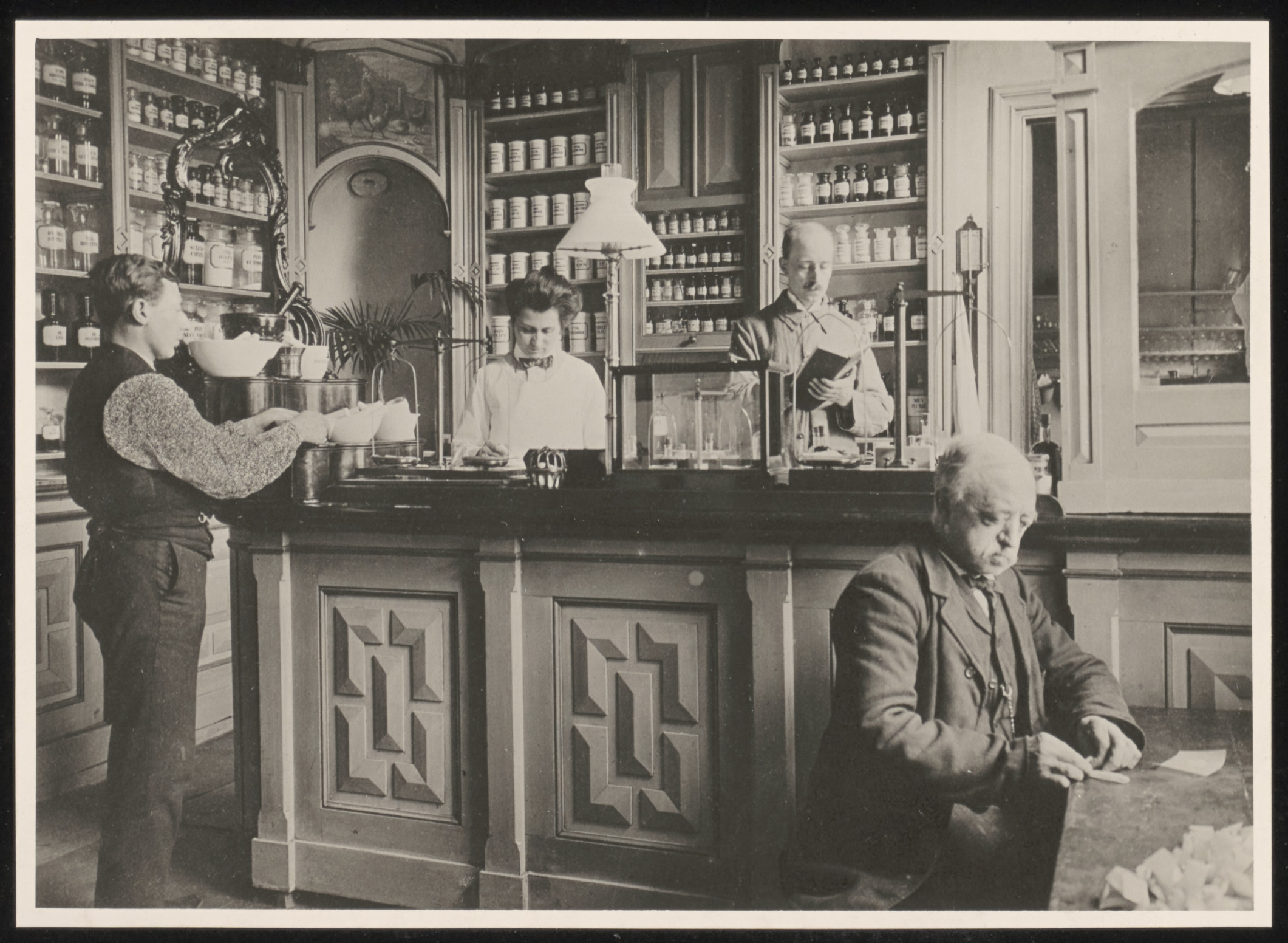 - Interieur van de apotheek van het Gast- of Ziekenhuis aan het Beverwijcksplein. V.l.n.r. Arie v.d. Griend, knecht (in 1957 gepensioneerd in het Gemeenteziekenhuis a.d. Bankastraat), mej. C.H. Benjaminse apothekersassistente uit A'dam, dhr. J. Logger apotheker (vader van de latere apotheker Logger Krispijn-apotheek 'De Vijzel' en 'Wantij-apotheek'), Klaas (Nicolaas) van der Steen, knecht (overleed in het Bestedelingenhuis aan het Bagijnhof).
