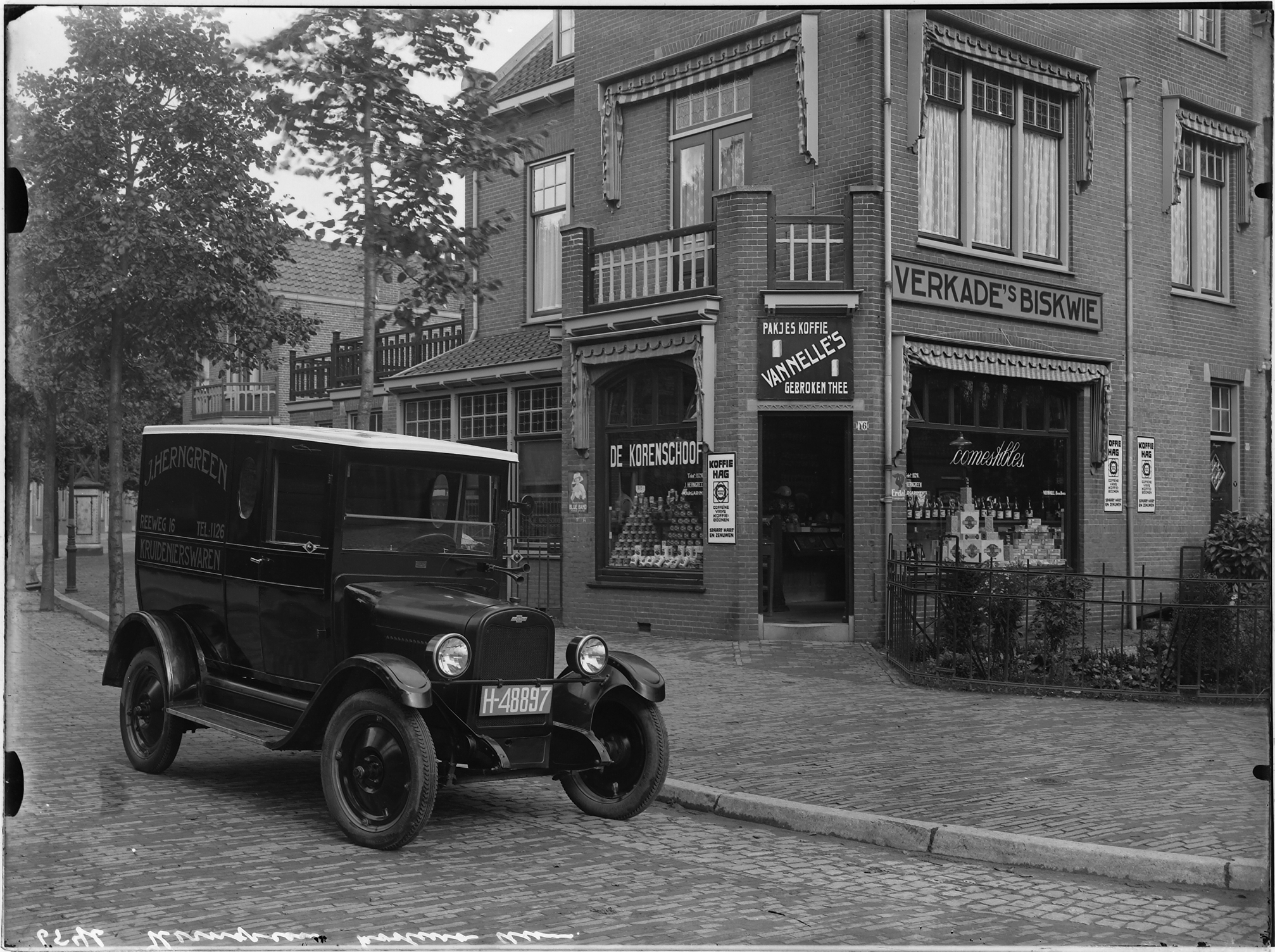 - Exterieur kruidenierswinkel J. Herngreen aan de Reeweg Oost met bestelwagen