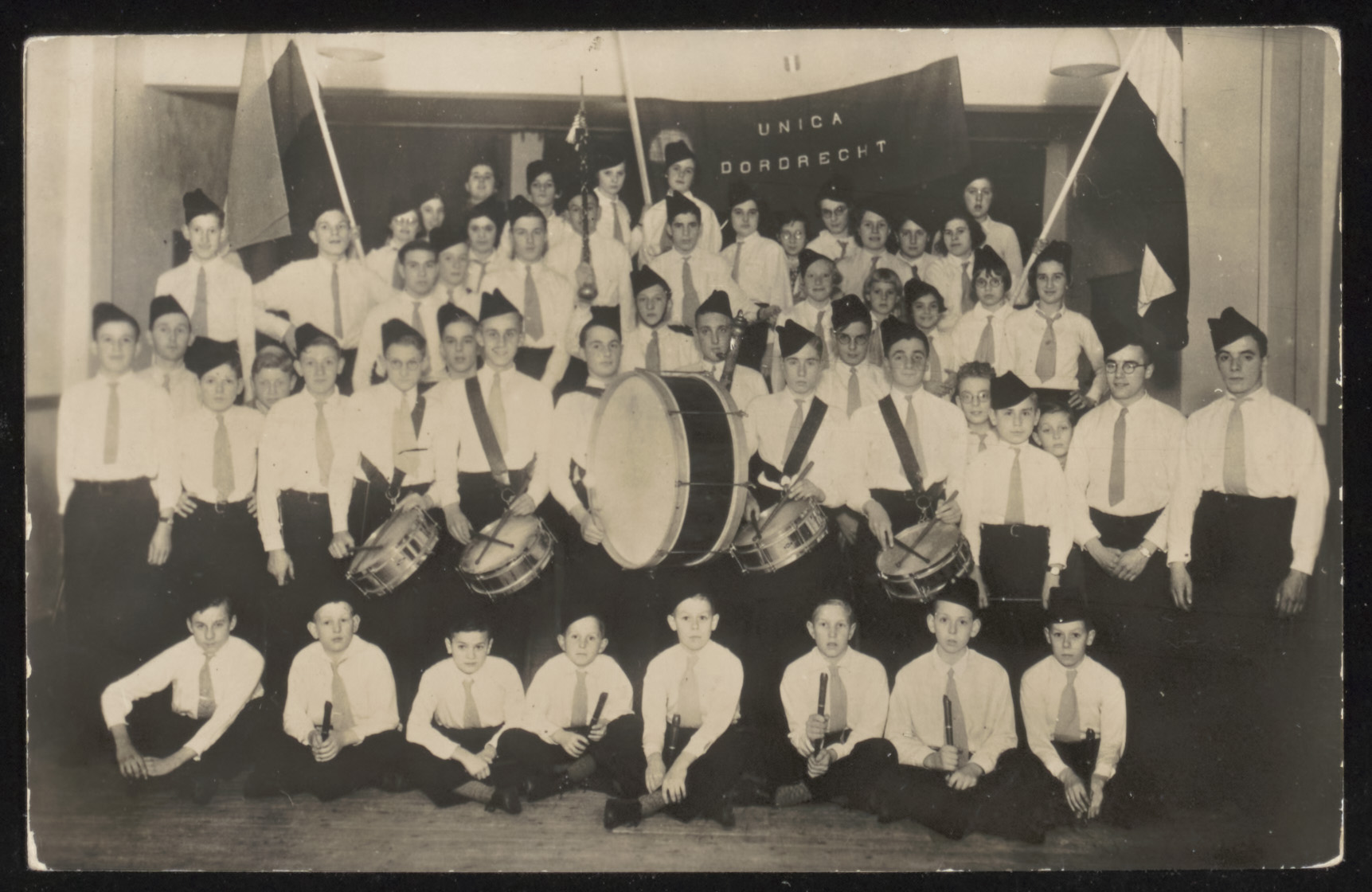 - Groepsportret van het meisjeszangkoor en fluitkorps Unica.
