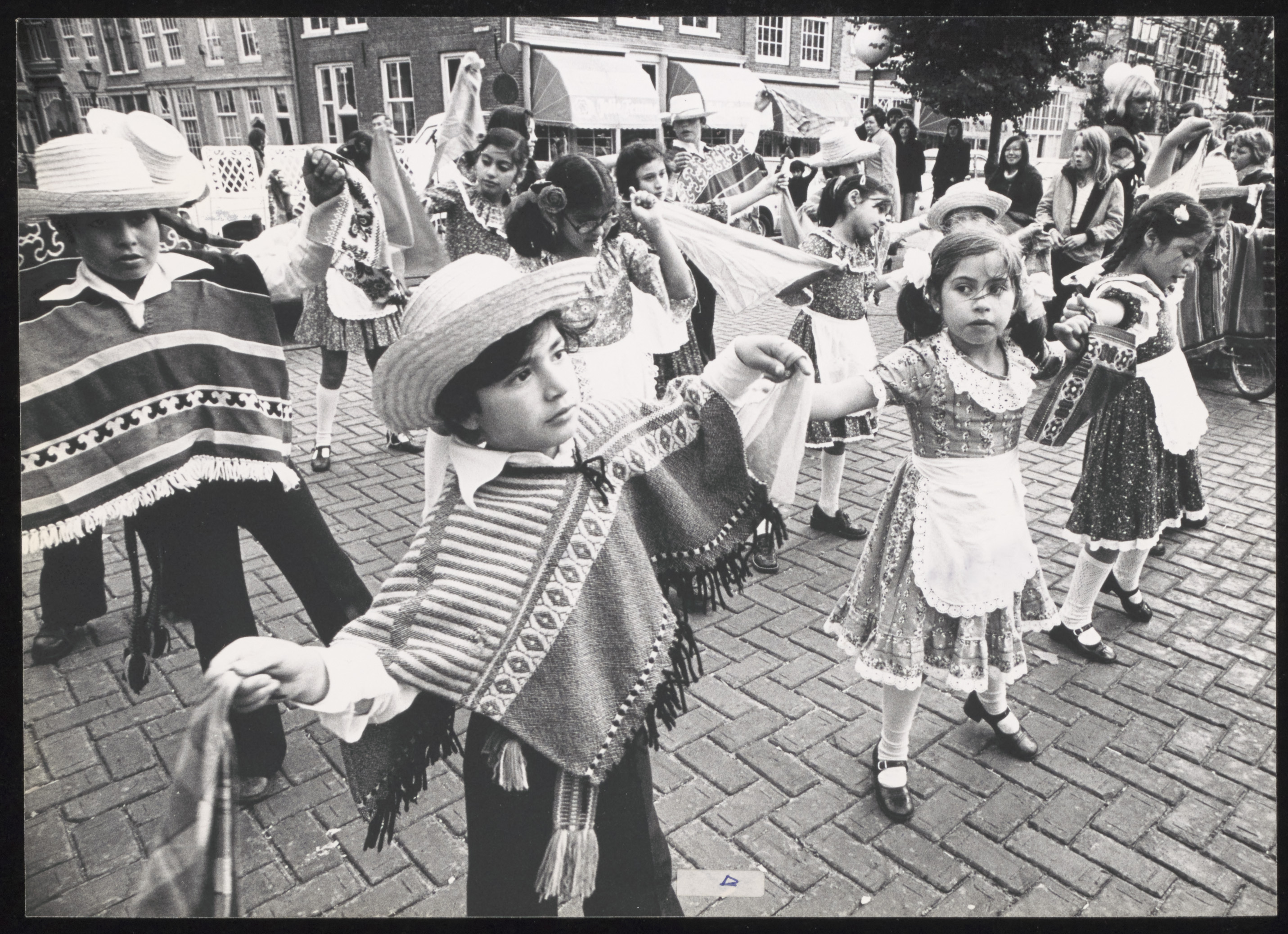 - Optreden van verklede kinderen op het Statenplein. Op de achtergrond de hoek Hofstraat / Nieuwstraat.