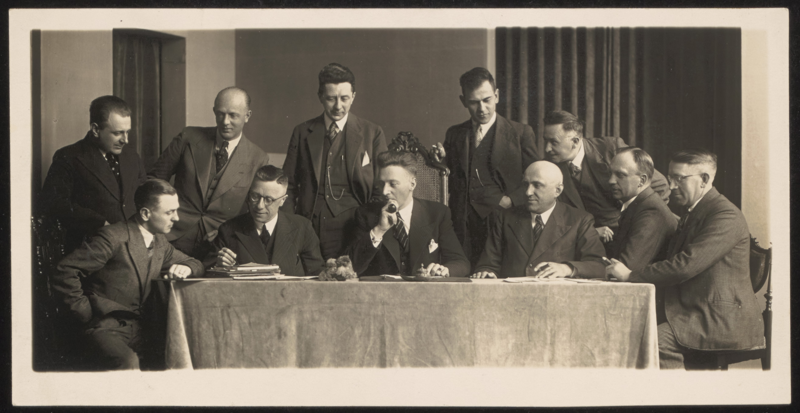 - Groepsportret van winkeliers. Links aan tafel zittend Jacobus Wilhelmus Marie Busch op ongeveer 30-jarige leeftijd. Andere aanwezigen Hoppenbrouwers, J.B. Overwijn, J. Trossel, Frijling, Heerema, Veringa, Kool, Beerman, IJdo en Mol.