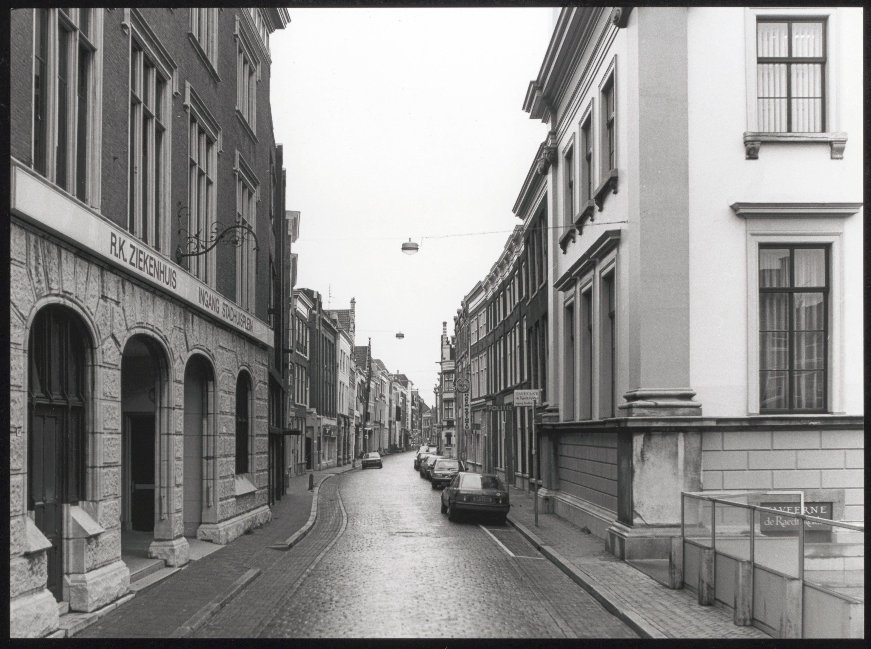 - Links het RK ziekenhuis in het voormalig hoofdbureau van politie aan de Groenmarkt, rechts het.stadhuis.