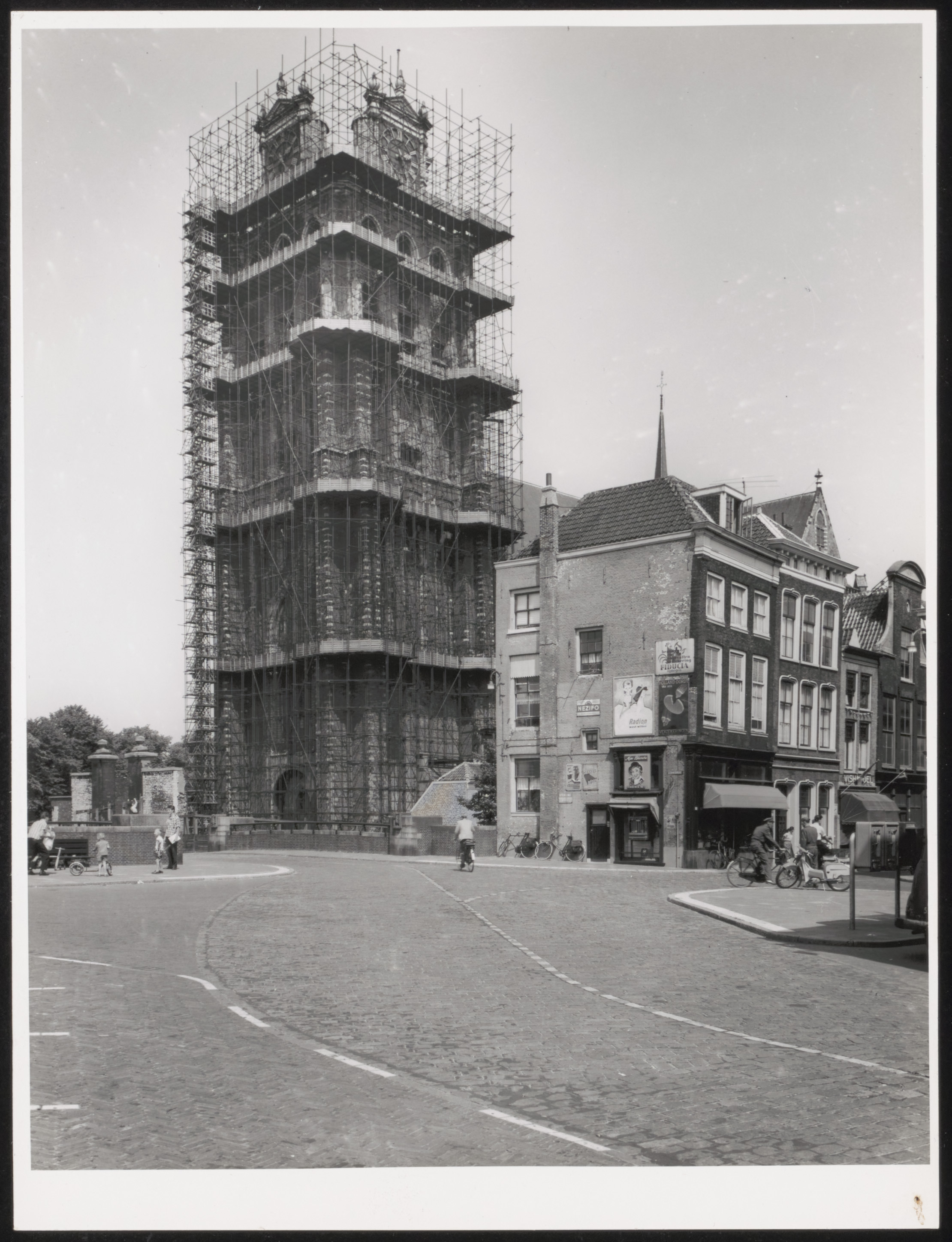- De toren van de Grote Kerk in de steigers tijdens restauratie, gezien vanuit de Prinsenstraat. Rechts de Voorstraat.