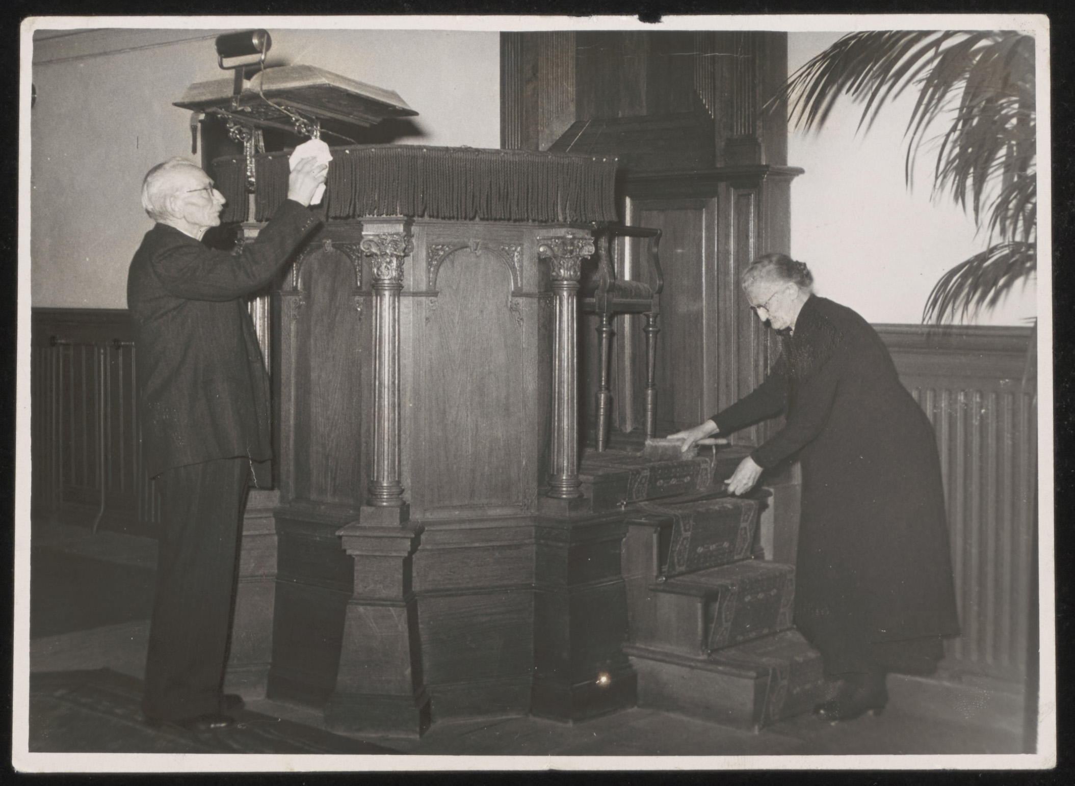 - De koster en zijn vrouw onderhouden preekstoel van de Doopsgezinde Kerk in de Lenghenstraat.