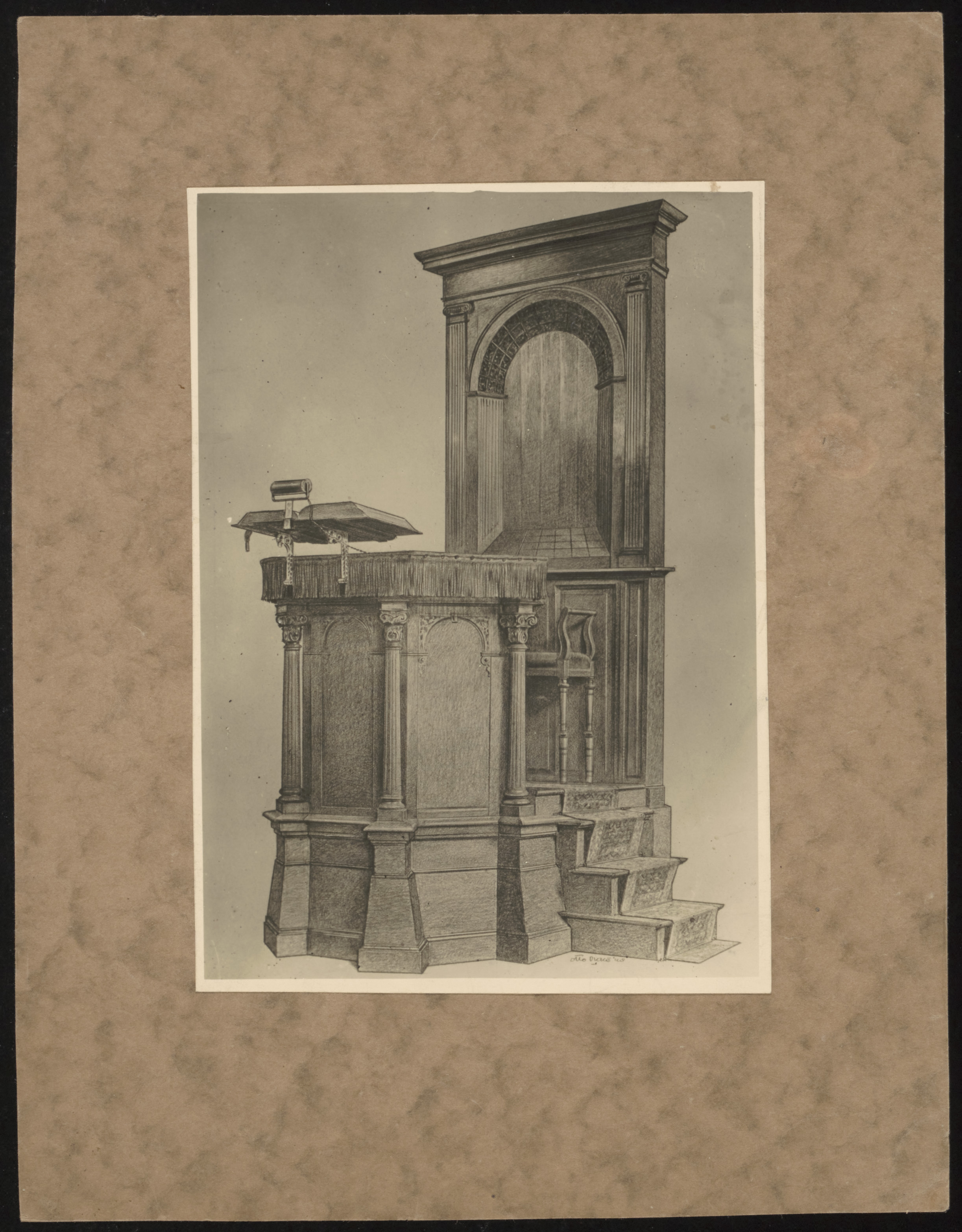 Tekening door Otto Dicke van de preekstoel van de Doopsgezinde Kerk in de Lenghenstraat.