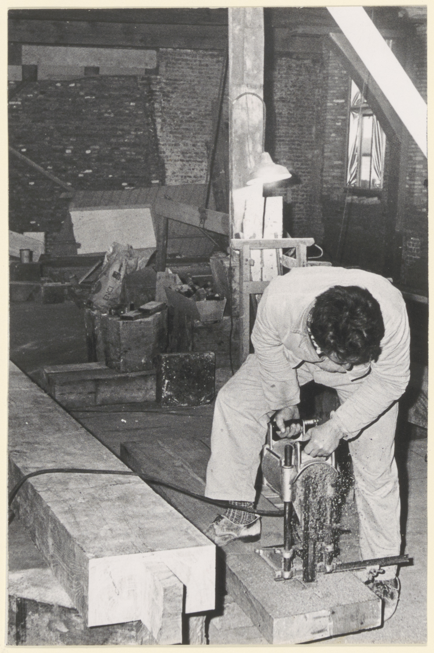 - Het hakken van nieuwe steunen voor de moerbinten van de vloer van de slaapzaal van het voormalige Augustijnenklooster in het Hof in het kader van de restauratie van het complex; de zaal ligt boven de Statenzaal.