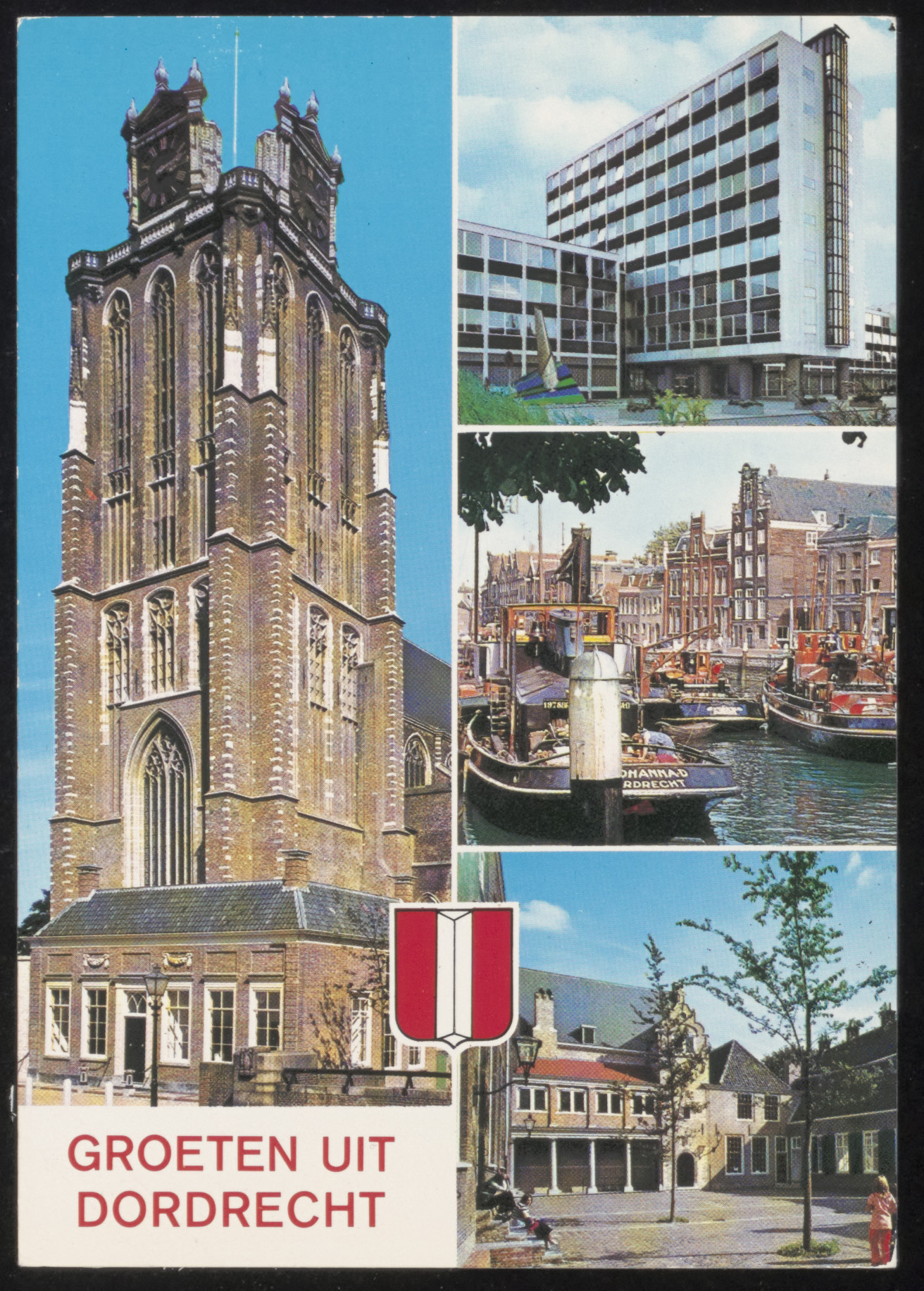 L: Grote kerk. RB: Stadskantoor Spuiboulevard. R: zicht op de Kuipershaven. RO: 't Hof.