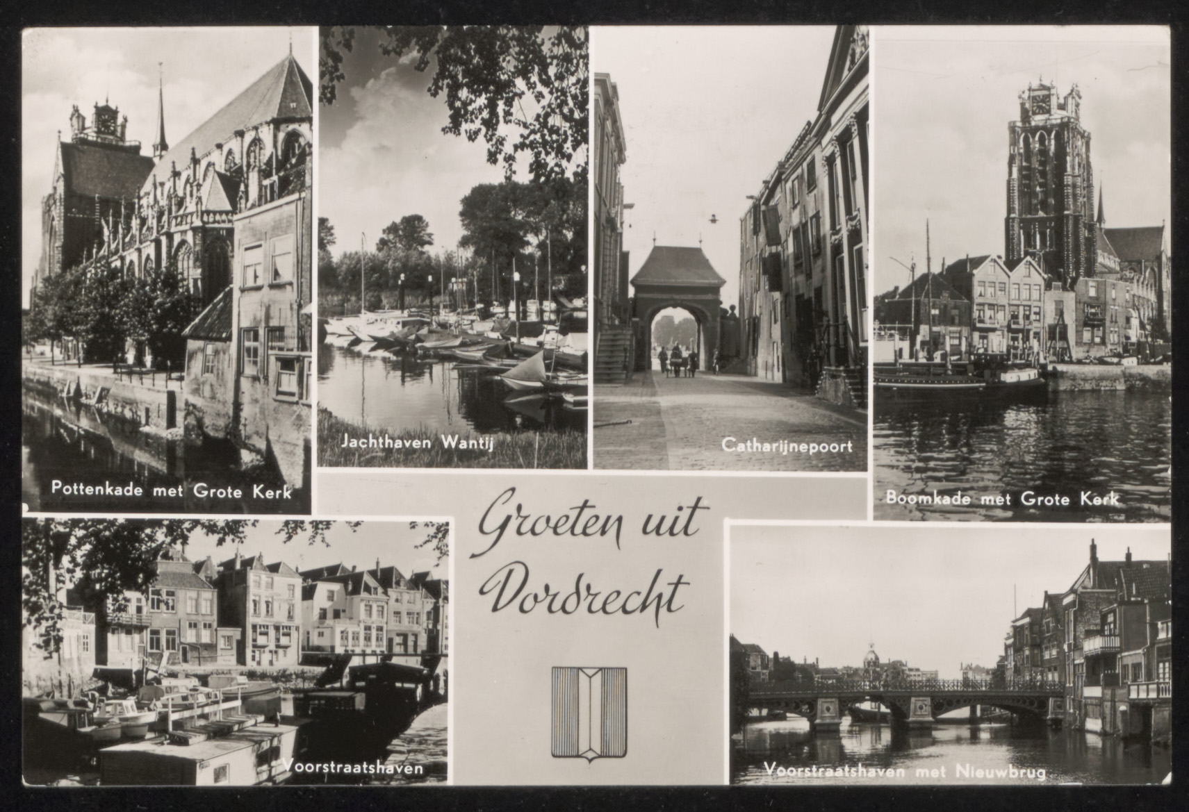 LB: Potenkade met Grote Kerk. LM: Jachthaven Wantij. RMB: Catharijnenpoort. RM: Bomkade met Grote kerk. LO: Voorstraatshaven. RO: Voorstraatshaven bij de Nieuwbrug.