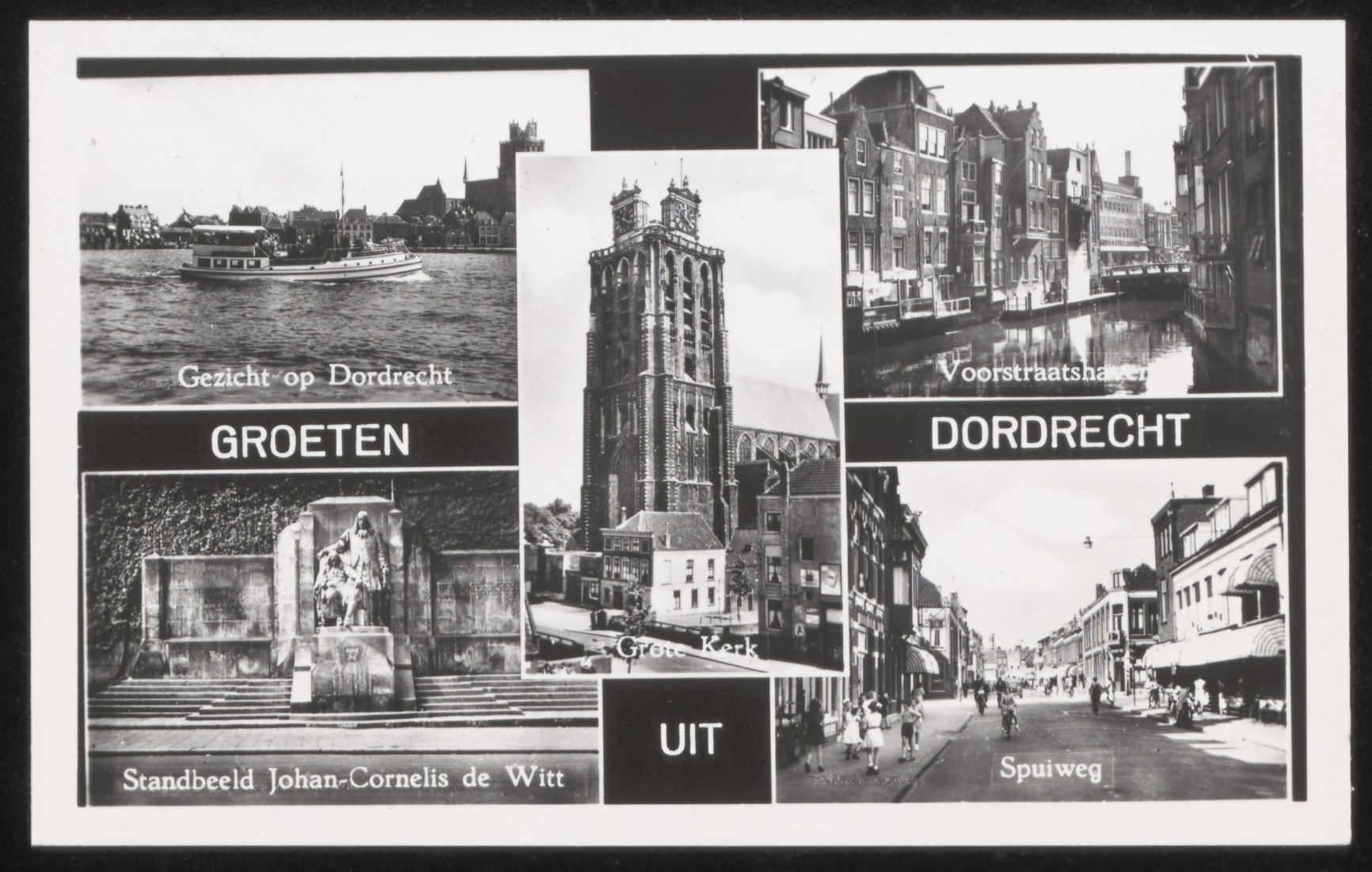 LB: Vanaf Zwijndrecht zicht op Dordrecht. M: Grote Kerk. RB: Voorstraatshaven-Scheffersplein. LO:Stanbeeld Johan en Cornelis de Witt op de Visbrug. RO: Spuiweg richting Centrum.