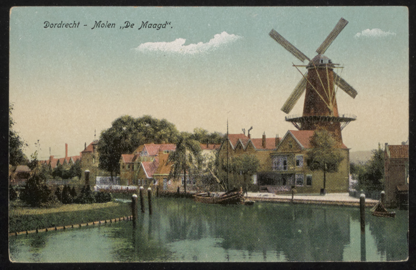- Spuihaven gezien vanaf de Johan de Wittbrug met molen De Maagd aan de Cornelis de Wittstraat.