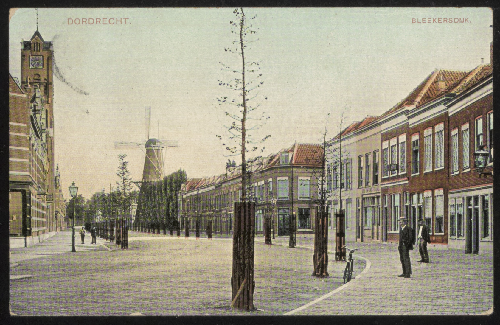 - Links de Wilhelminakerk aan de Blekersdijk. Op de achtergrond molen De Maagd aan de Cornelis de Wittstraat.
