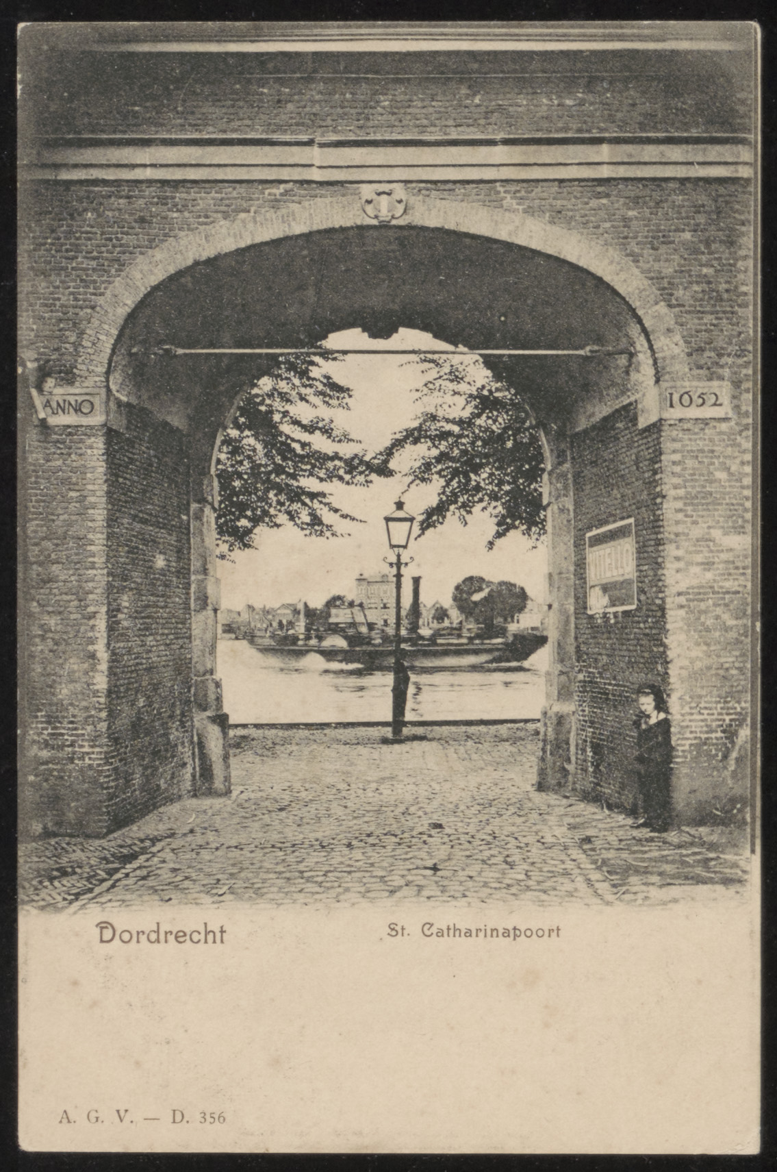 - De Catrijnepoort aan het eind van de Korte Engelenburgerkade, met gezicht op de veerpont Dordrecht - Zwijndrecht.