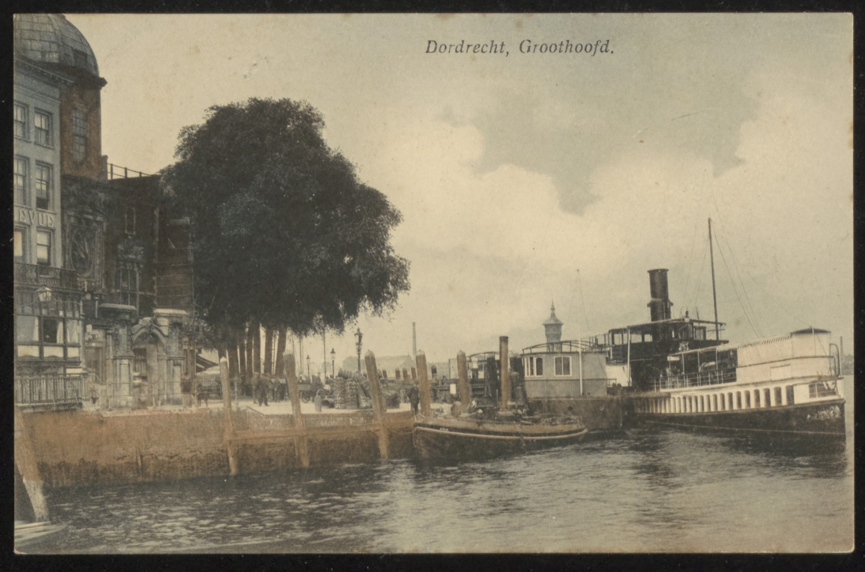 Raderrboot van Fop Smit.aan het Groothoofd. Links Hotel Bellevue.