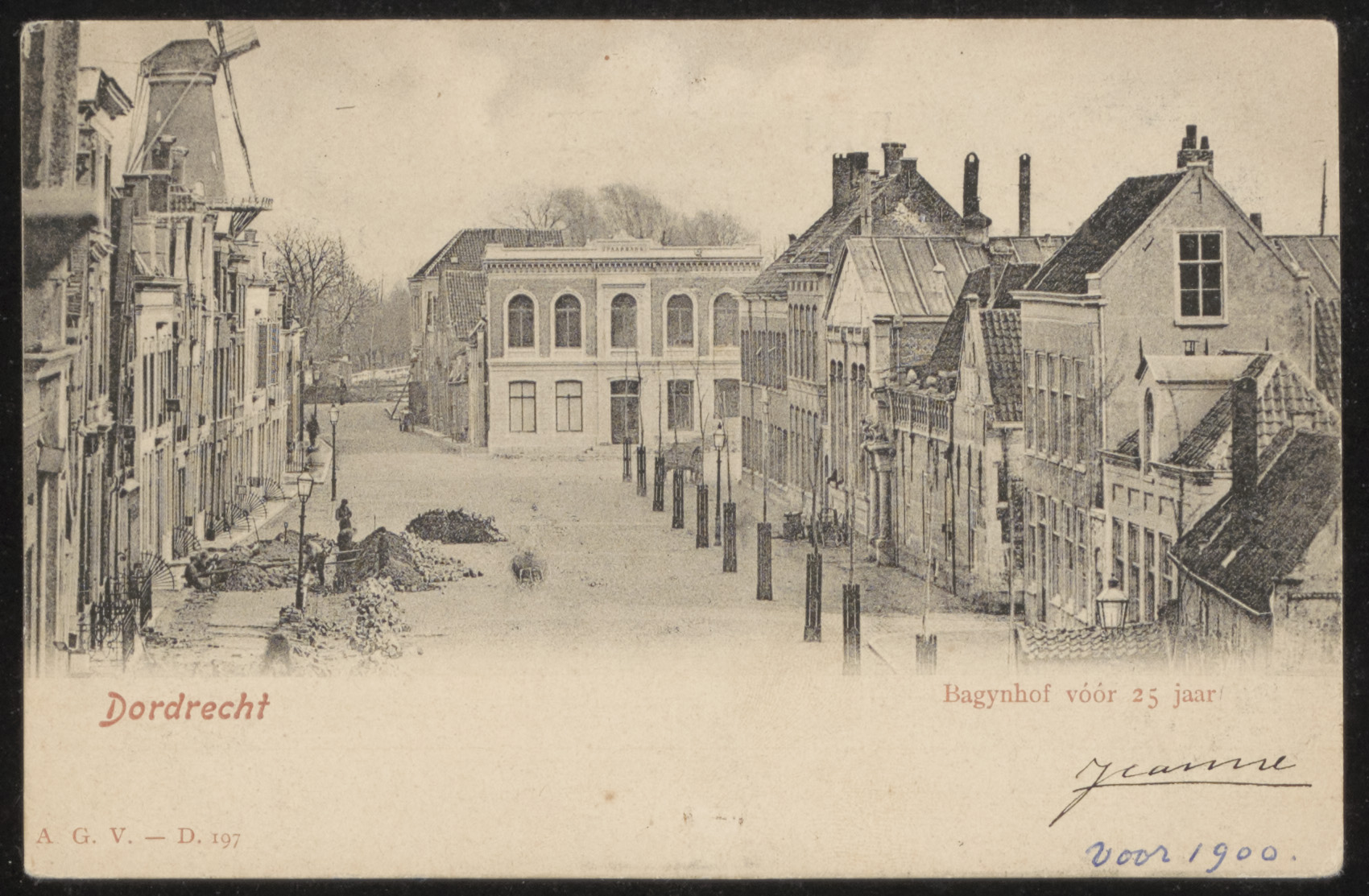 - Baginhof richting de spaarbank op de hoek van de Johan de Wittstraat. Llinks molen De Maagd in de Cornelis de Wittstraat. Halverwege rechts de poort van het Oudevrouwenhuis.