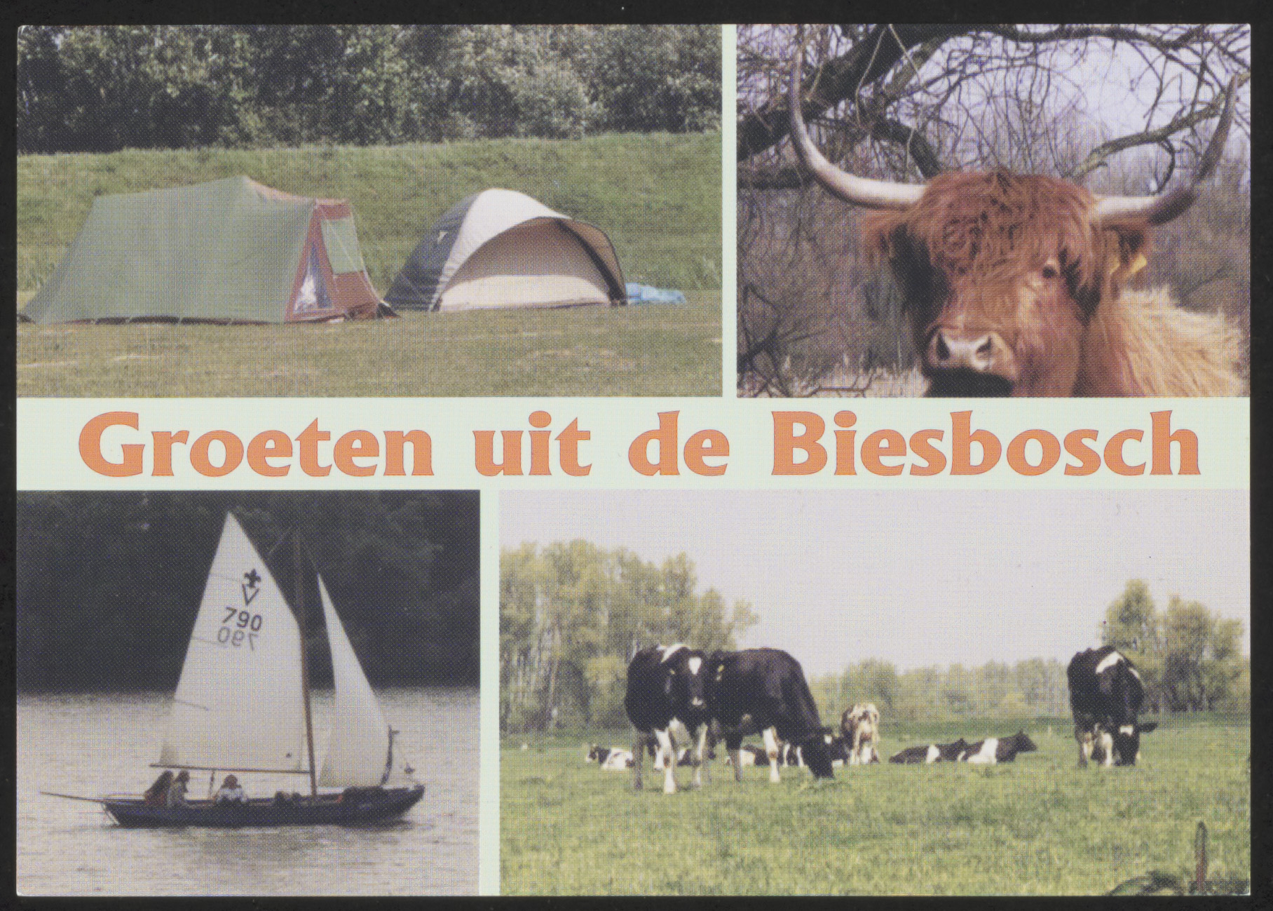- ansichtkaarten / prentbriefkaarten koeien Schotse hooglanders tenten zeilvaartuigen
