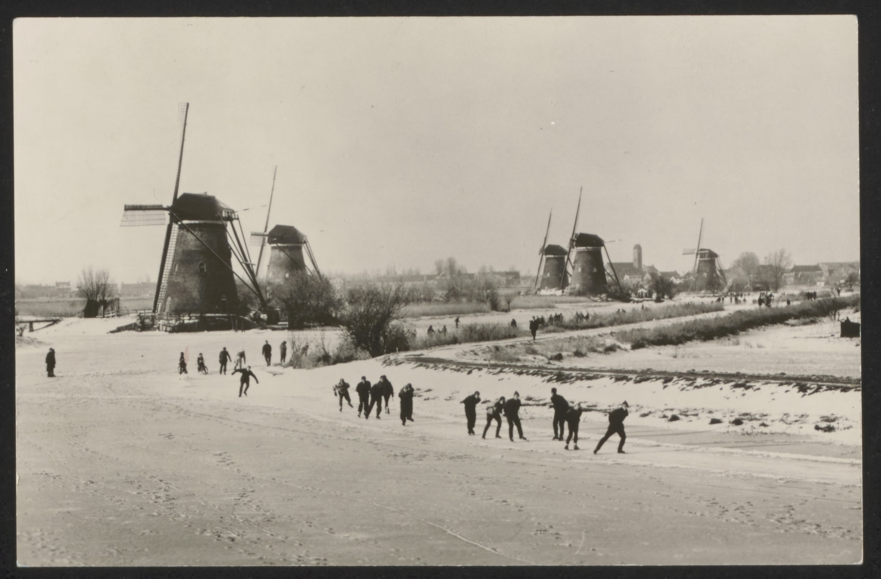 - Schaatsers langs de molens aan de Molenkade Nederwaard in Kinderdijk. V.l.n.r. Molen Nederwaard no. 5, no. 4, no. 3, no. 2 en no. 1.