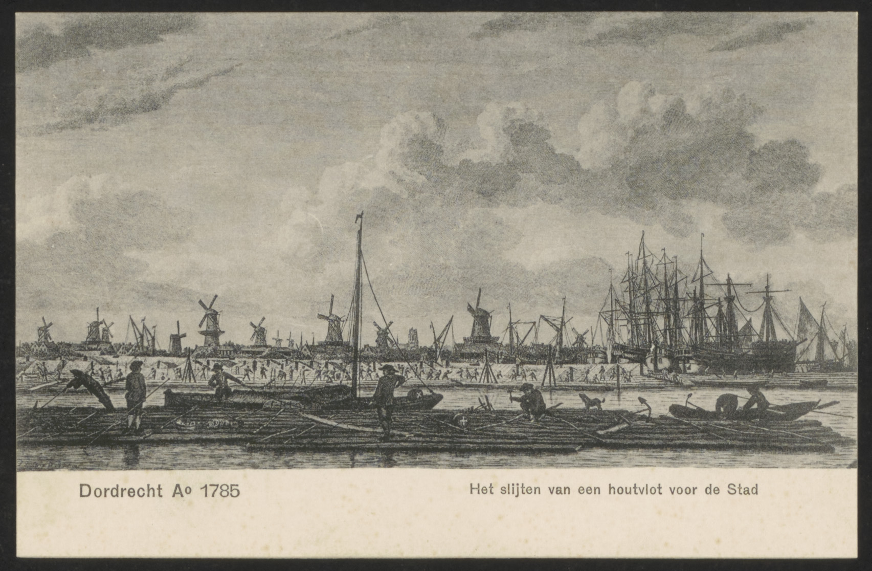 - Tekening door K.F. Bendorp van een houtvlot op het Wantij. Noordendijk met molens, o.a. molen De Kraker direct links van de Grote Kerk.