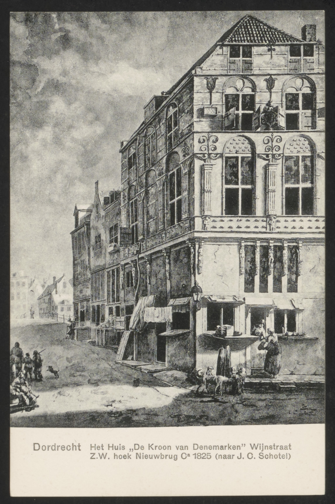 - Tekening door J.C. Schotel van huis De Kroon van Denemarken aan de Wijnstraat, hoek Nieuwbrug.
