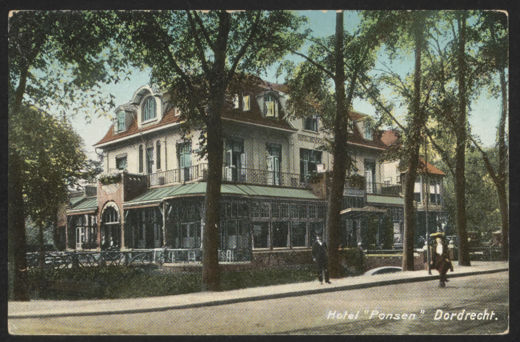 - Hotel Ponsen aan de zijde van de Stationsweg op de hoek van de Burgemeester de Raadtsingel (links).