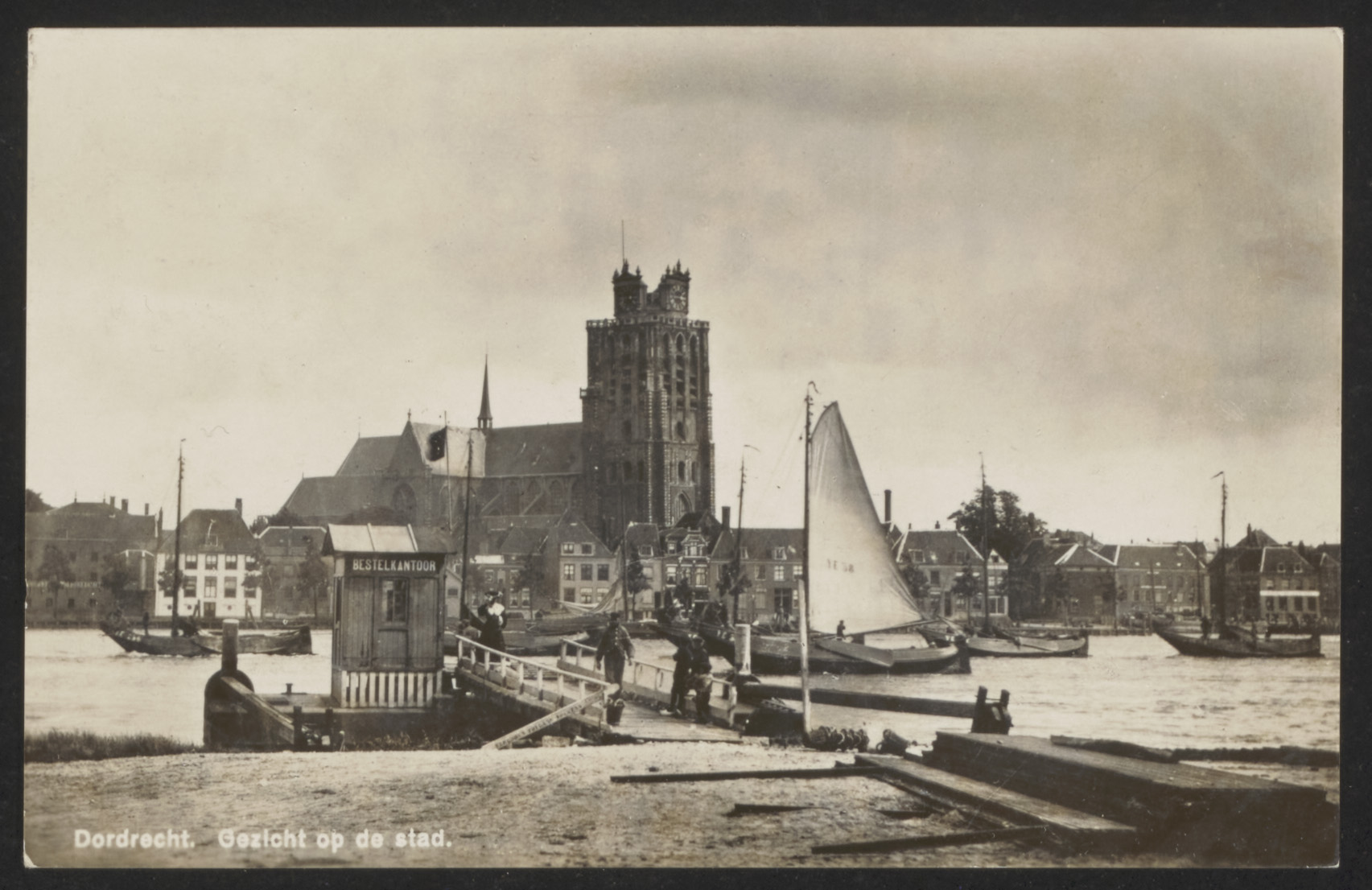 Vanaf het Veerplein in Zwijndrecht zicht op Dordrecht met op de voorgrond aanlegplaats veerboot.