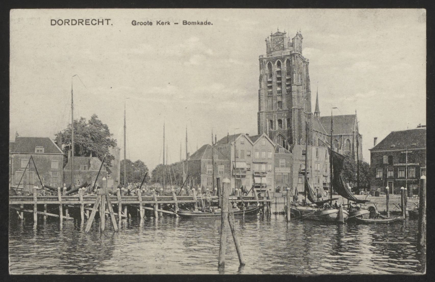 - De Grote Kerk gezien over de Bomhaven naar de Korte Geldersekade en de Mazelaarsstraat (links).