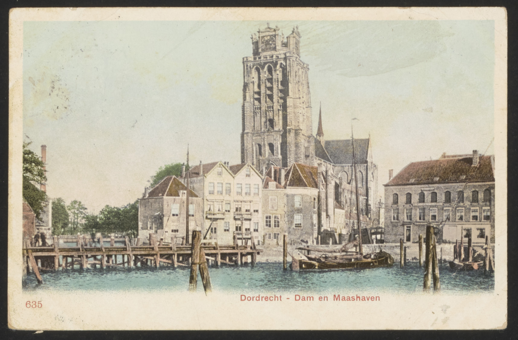 - De Grote Kerk gezien over de Bomhaven naar de Korte Geldersekade.